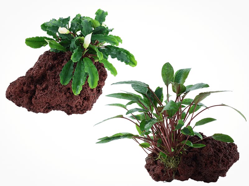 En esta categoría tenemos una colección de plantas ya enraizadas en roca volcánica roja, de tal manera que se facilita mucho la ubicación dentro del acuario.