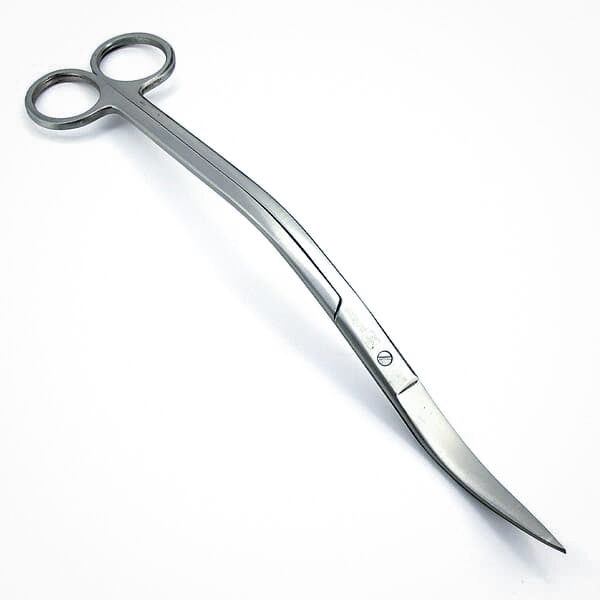 Para esta labor de poda la mejor opción son las tijeras curvas de aquascaping para poder acercarte bien al fondo y cortar la planta al ras.