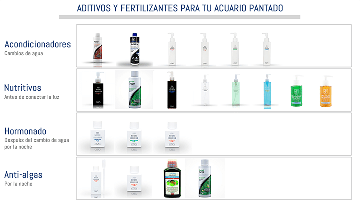 En cuanto a los fertilizantes y aditivos líquidos para acuarios plantados, nosotros establecemos 4 categorías en función de sus características: