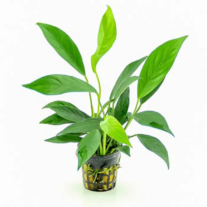 Anubias Barteri var Glabra es una variedad de color verde intenso jaspeado con hojas lanceoladas.