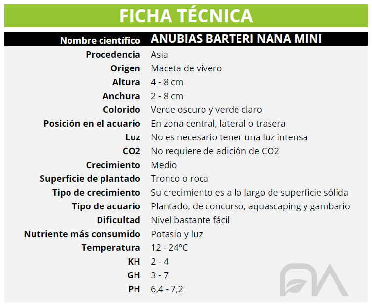 La planta acuática ANUBIAS NANA MINI es una variedad de anubia que nos ofrece una hoja de tamaño muy pequeño.