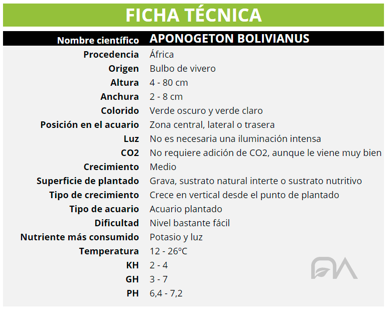 La planta acuática APONOGETON BOLIVIANUS tiene la hoja alargada en tonos verdes.