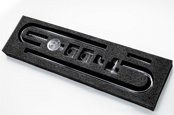 La pipa de salida mejora el intercambio gaseoso gracias al accesorio especial que viene incluido, Neo Reliever, que permite modificar la intensidad y la dirección del flujo de agua.