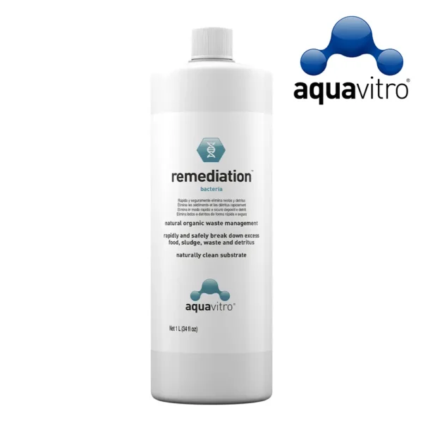 Aquavitro Remediaton Bacteria 1000 ml es un producto que se usa en acuarios para mantener el agua más limpia y saludable. Contiene bacterias buenas que ayudan a descomponer restos de comida y desechos en el agua.