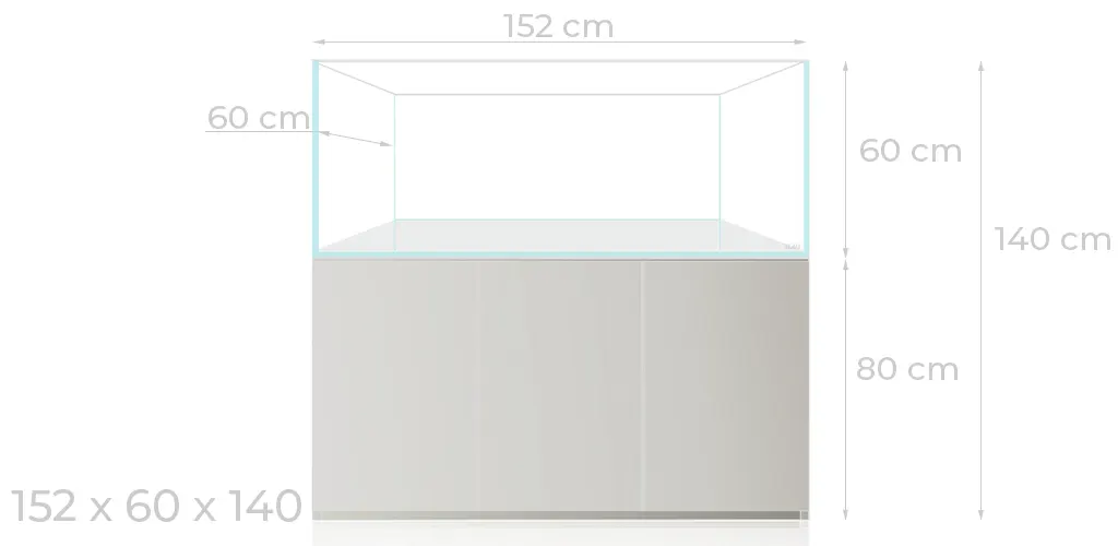 Blau Gran Cubic Experience 540 L 152x60x60 mueble blanco es un acuario de cristal óptico ultra transparente pegado con silicona transparente y un grosor de cristal de 15 mm.