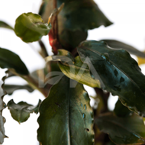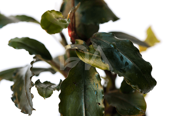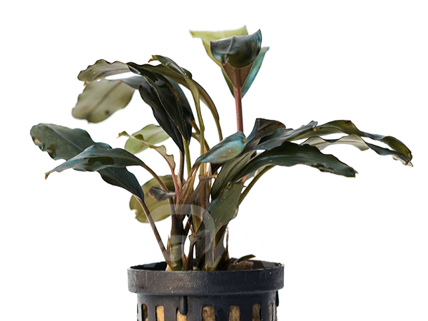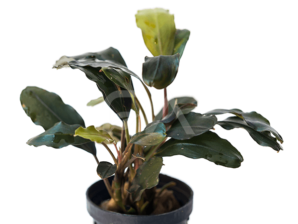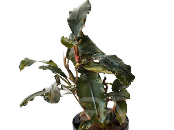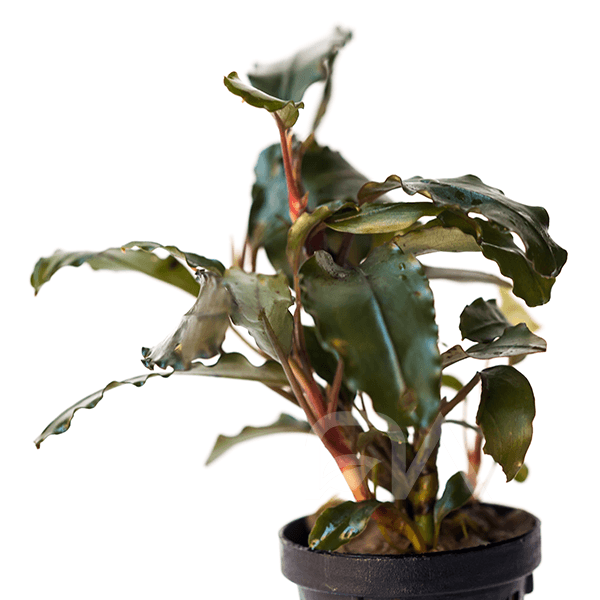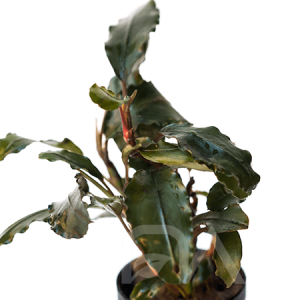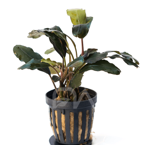 Esta especie rara de bucephalandra se caracteriza por pequeño tamaño y hojas redondeadas con los bordes ondulados.