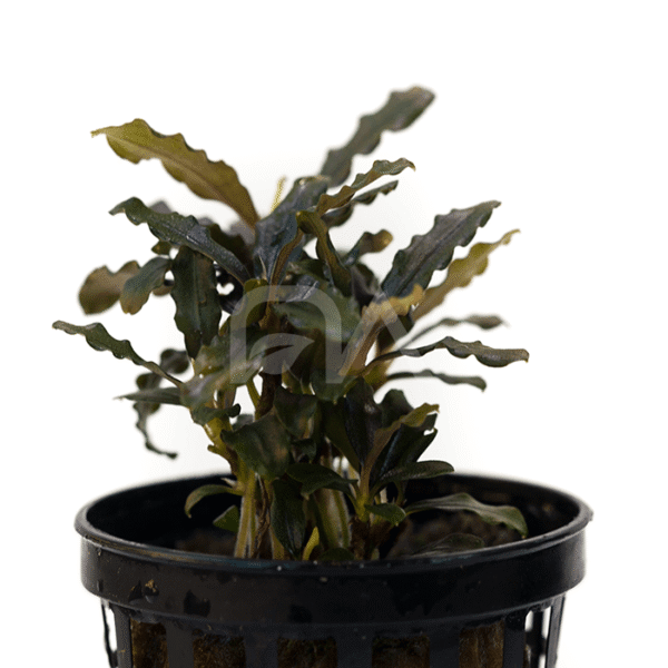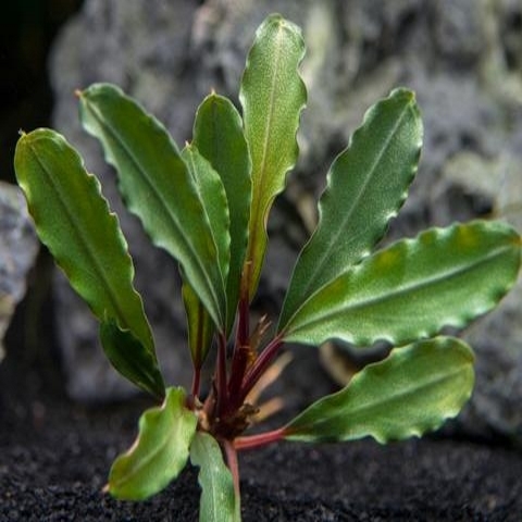 Esta variedad de bucephalandra, la SP Biblis, es una variedad relativamente fácil de encontrar y se caracteriza por sus hojas alargadas y rugosas en la punta.
