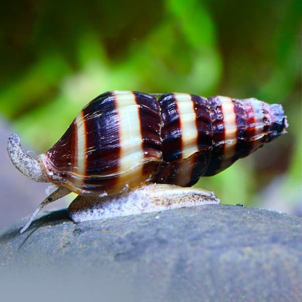- Tiene un caparazón en forma de espiral con bandas negras o marrones.