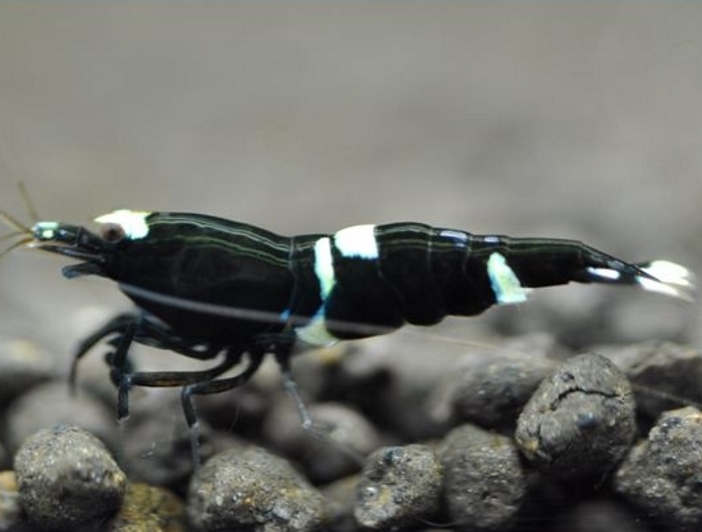 - Gamba para acuarios de agua dulce con el cuerpo negro y pequeñas franjas en blanco (algo azulado en ocasiones).