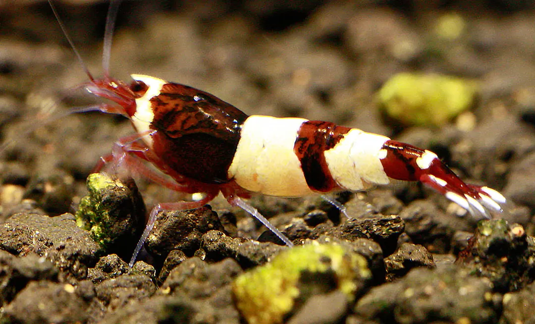 Estos camarones son conocidos por su color rojo intenso con bandas blancas.