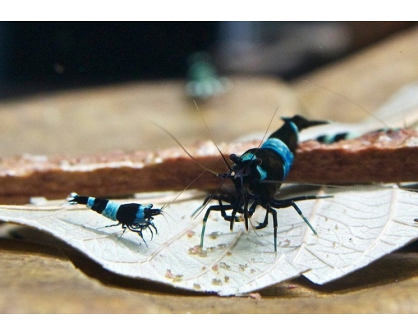 - Gamba para acuarios de agua dulce con el cuerpo negro y franjas de color azulado.