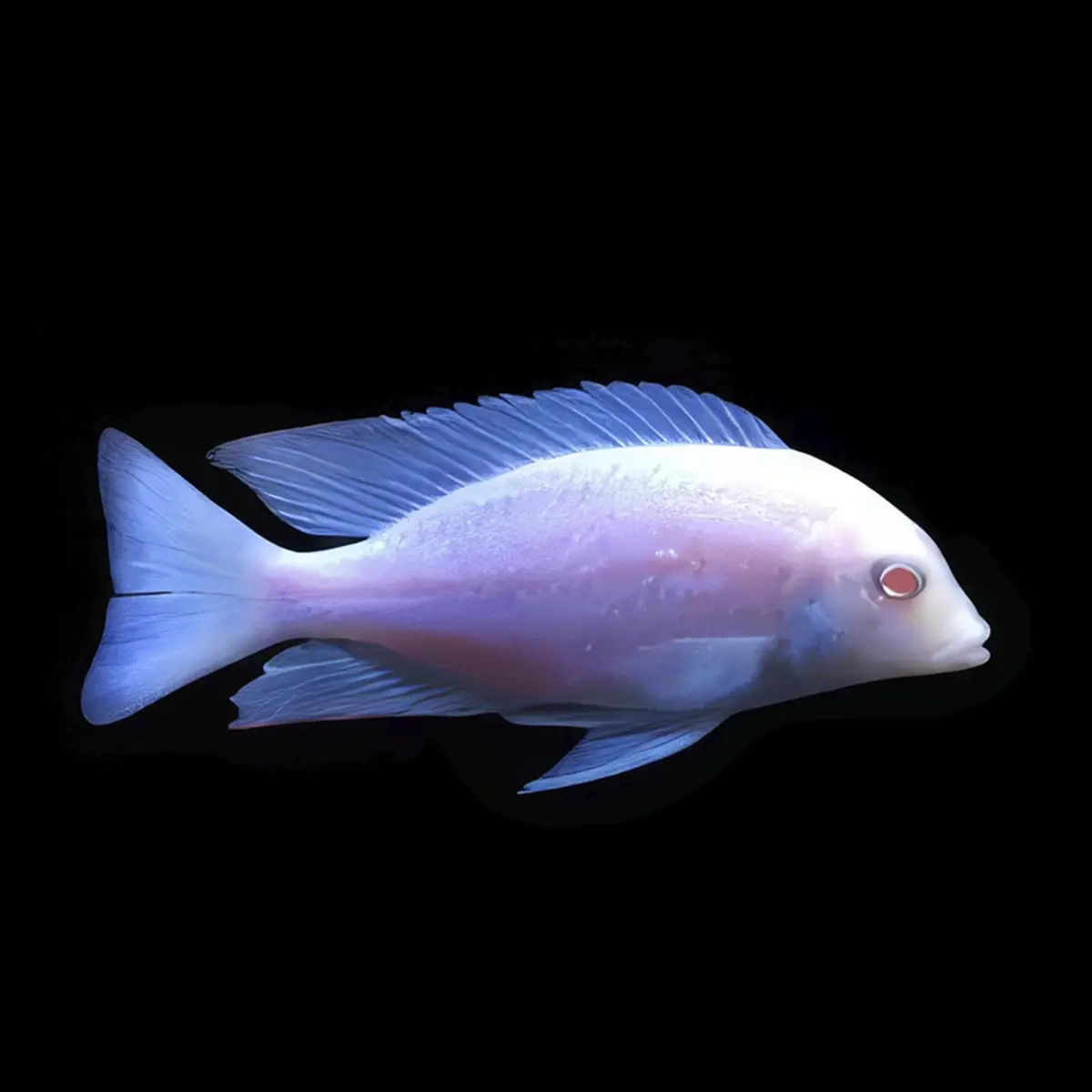 El Delfín Azul Albino es una versión aún más exótica del clásico Haplochromis moorii. Su llamativo color y su comportamiento activo lo convierten en una elección ideal para acuarios de cíclidos.