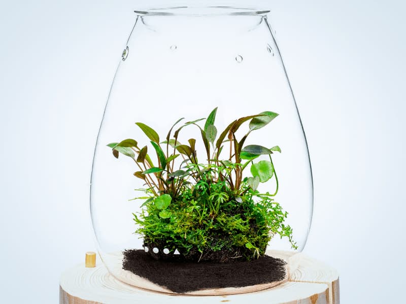 El DOOA Glass Pot Shizuku es un recipiente de cristal con tapa, totalmente transparente, para el mantenimiento de plantas.