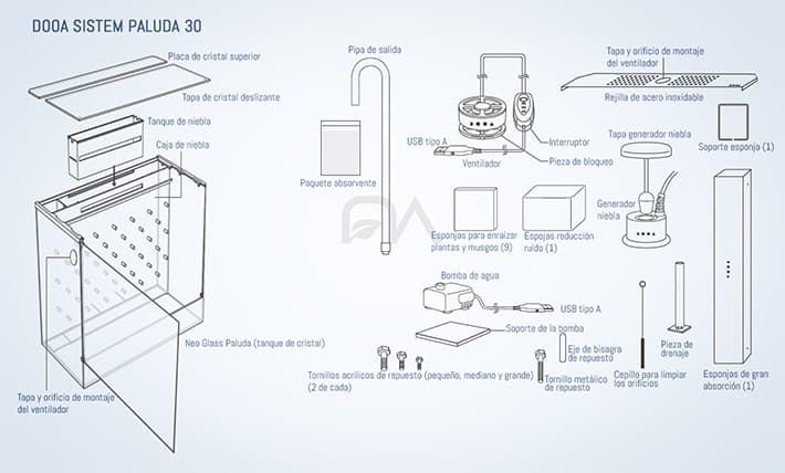 El despiece tanto en el PALUDA 30 como en el PALUDA 60 es el mismo, la única diferencia es el tamaño del paludario y el número de esponjas.