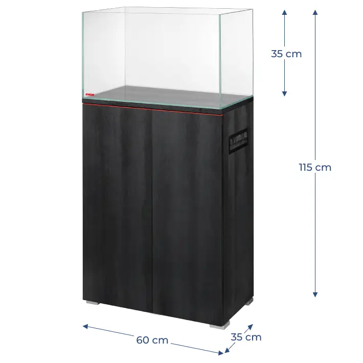 Eheim ClearScape 73 es un acuario de cristal óptico fijado con silicona transparente de 60x35x35 cm que incluye la mesa de soporte en un elegante color negro.
