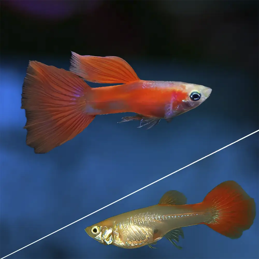 El Guppy Full Red Premium es uno de los guppies más llamativos y populares en el mundo del aquascaping debido a su color rojo intenso que cubre todo su cuerpo, desde la cabeza hasta la cola.