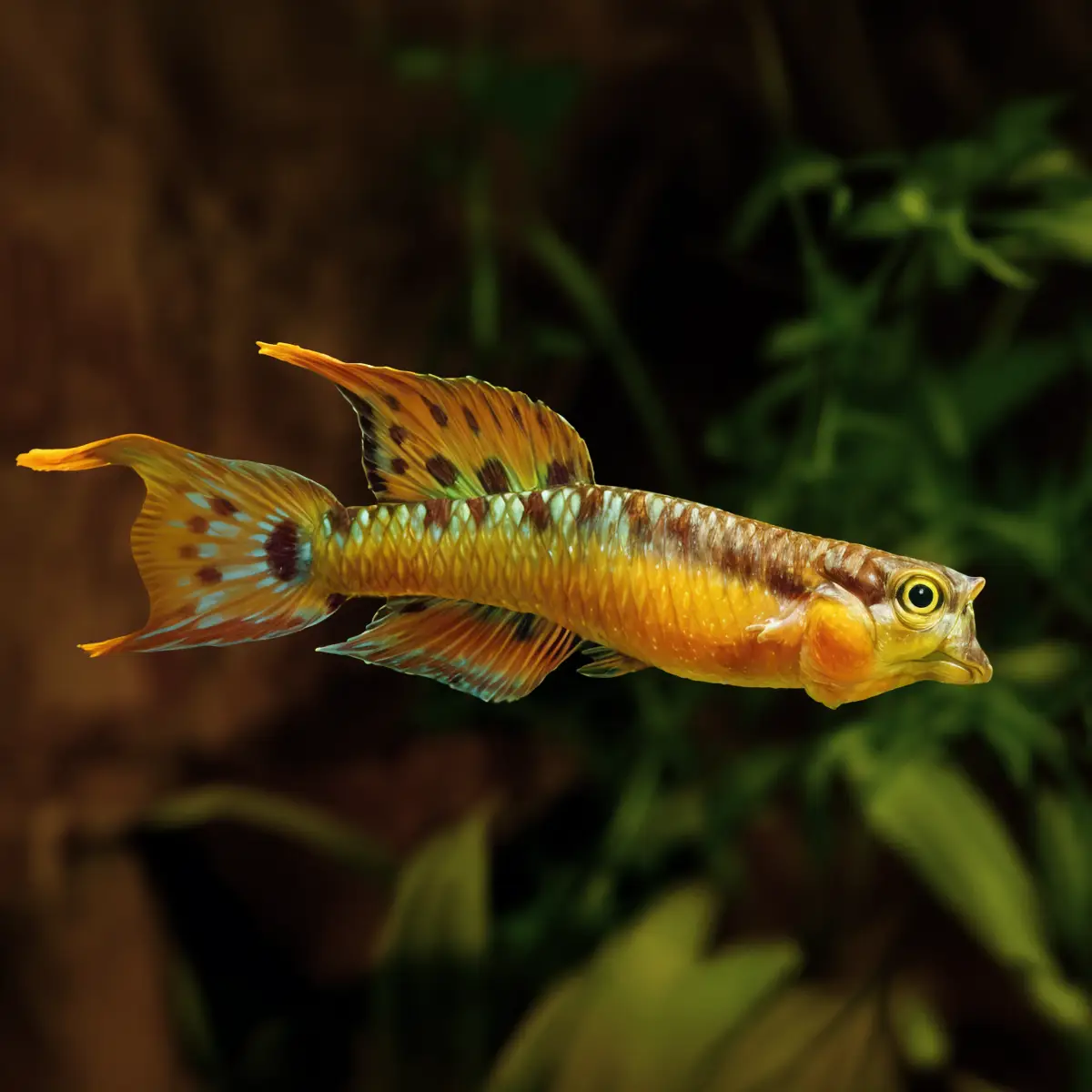 El Killie Aphyosemion bivittatum Funge, una subespecie del conocido Aphyosemion bivittatum, es un pez de agua dulce de gran belleza y carácter pacífico, ideal para acuarios plantados.