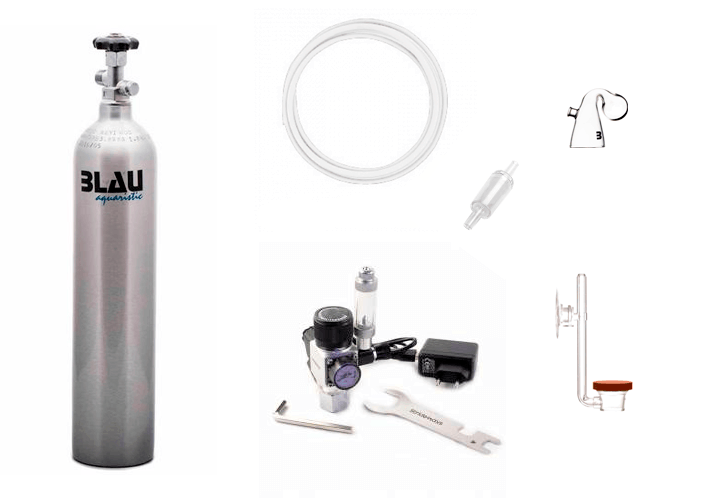 Kit de CO2 con bombona recargable de 1L y todos los elementos necesarios para introducir CO2 en tu acuario de forma externa.