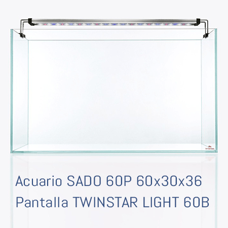 KIT STRIDEWAYS SADO 60P es un set de acuario de cristal óptico y pantalla TWINSTAR LED RGBW 60B, ideal para acuarios plantados y de aquascaping.