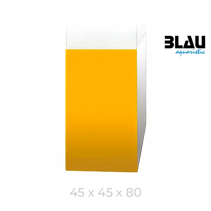 La mesa Blau Blanco Brillante 45x45x80 con la puerta frontal en color naranja, está diseñada para soportar el peso de un acuario, optimizando el espacio interior para albergar filtros y accesorios.