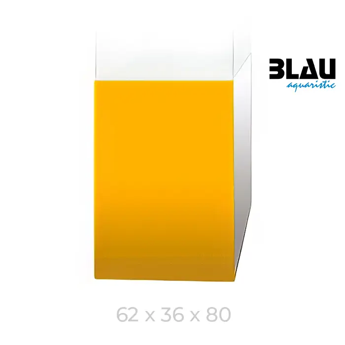 La mesa Blau Blanco 62x36x80 con la puerta frontal en color Naranja, está diseñada para soportar el peso de un acuario, optimizando el espacio interior para albergar filtros y accesorios.