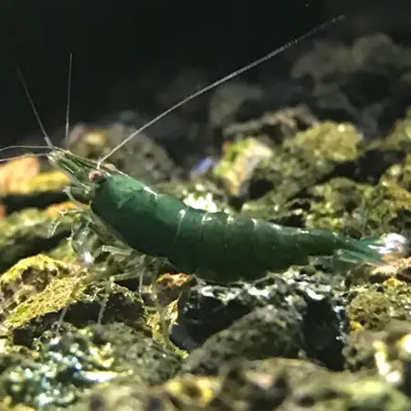 Neocaridina Green Jade, gamba para acuarios de agua dulce de color verde militar.