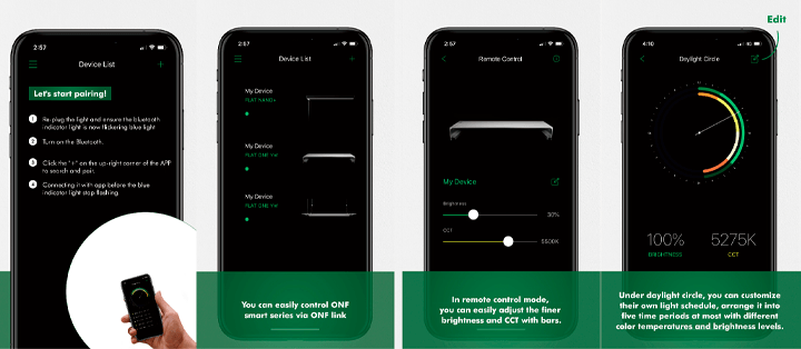 Te permite personalizar cambios de iluminación y temperatura durante el fotoperiodo a través de un modo llamado Daylinght Circle con el que podrás configurar y temporizar 5 grupos diferentes.
