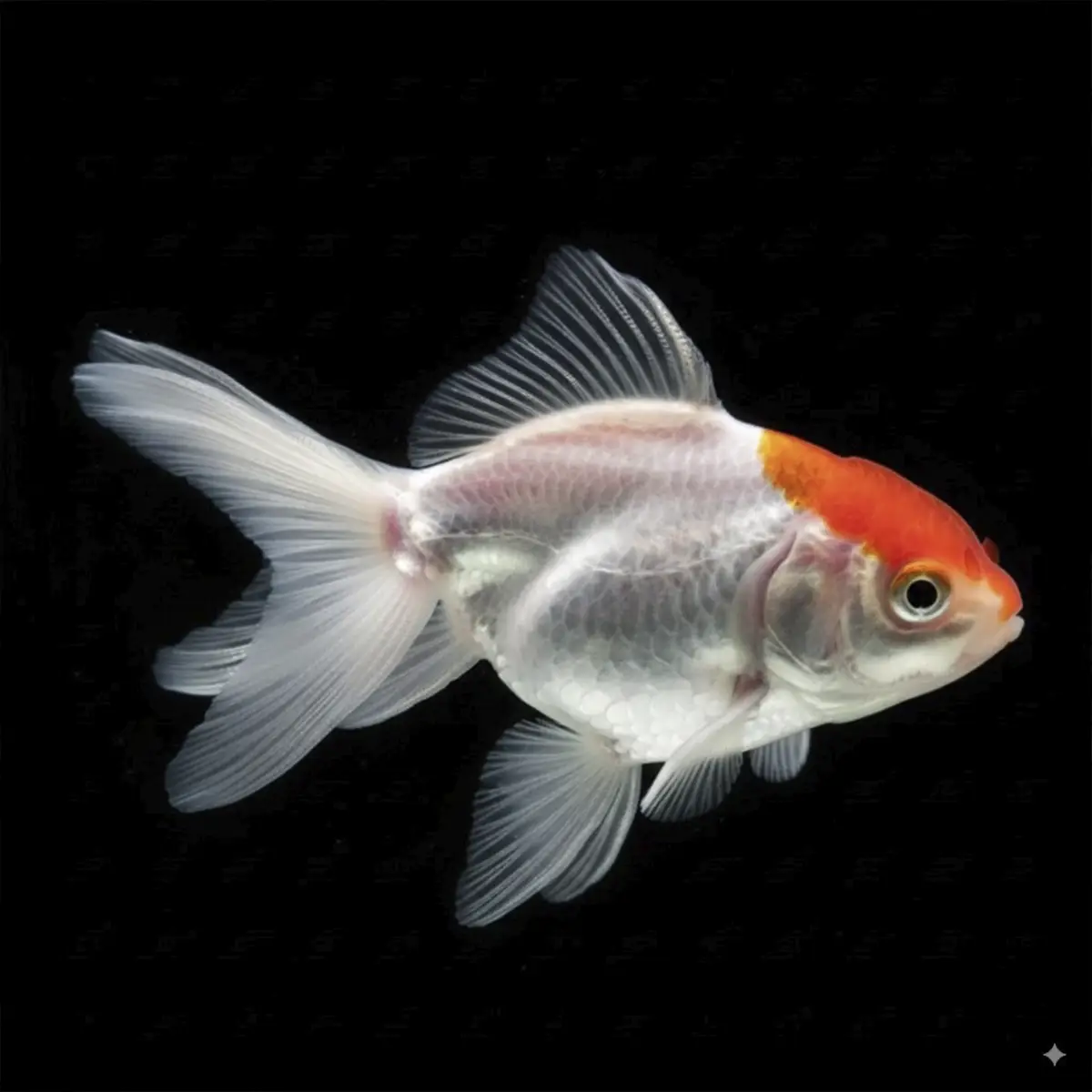 El Oranda Boina Roja es una variedad de pez dorado (Carassius auratus) que destaca por su llamativa corona roja sobre su cabeza blanca.