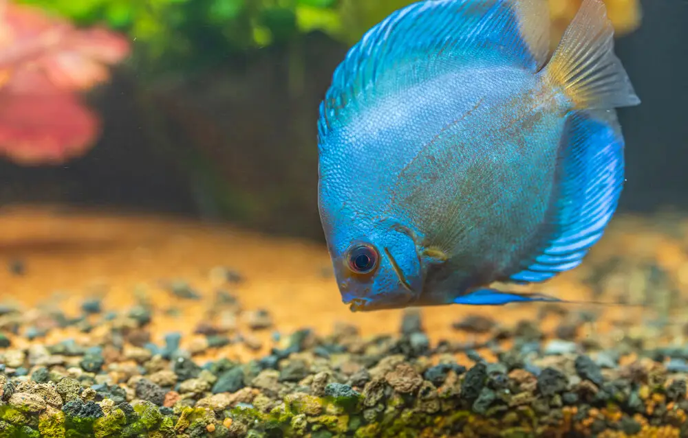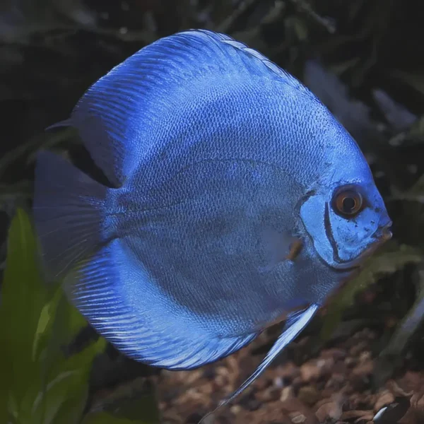 Pez Disco Diamond Blue es una especie de pez tropical de agua dulce que se destacan por su forma redonda y hermoso color azul.