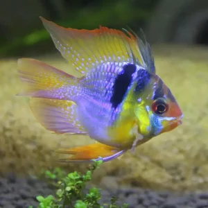 Ramirezi Electric Blue es un pez de acuario que pertenece a la familia de los cíclidos. Es conocido por sus colores azules brillantes y su comportamiento interesante.