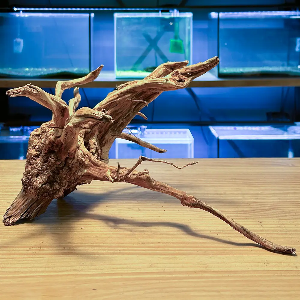 Esta raíz roja natural, conocida como Redmoore, es un espectáculo visual con sus formas intrincadas y tonalidades cálidas, además ofrece refugio y entretenimiento para tus peces.