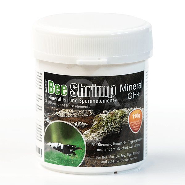 SaltyShrimp – Bee Shrimp Mineral GH+ 110g es una mezcla de sales minerales diseñada para remineralizar agua blanda en acuarios de gambas Caridina. Aporta minerales esenciales, aumenta el GH sin afectar prácticamente al KH y ayuda a mantener un pH estable y bajo.