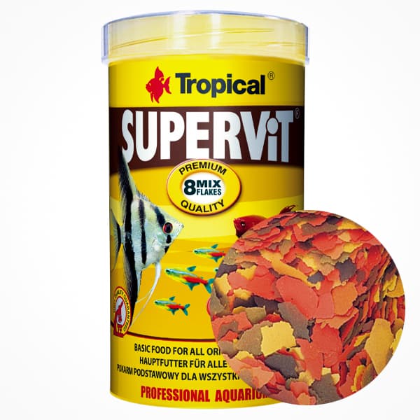 Tropical Supervit Basic 100 ml es un alimento básico en escamas para peces de acuario omnívoros. Contiene una mezcla de hasta ocho tipos de escamas diferentes, enriquecidas con vitaminas, minerales y estimulantes naturales para una dieta completa y equilibrada.