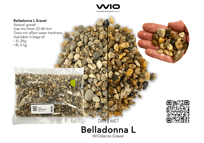 WIO BELLADONNA GRAVEL L 3 LITROS, grava 100% natural con granulometría 20 ∼ 40 mm con aspecto de grava de río de tamaño grande.