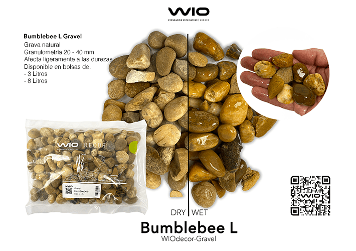 WIO BUMBLEBEE GRAVEL L 8 LITROS, grava 100% natural con granulometría 20 ∼ 40 mm con aspecto de canto rodado de río de tamaño mixto.